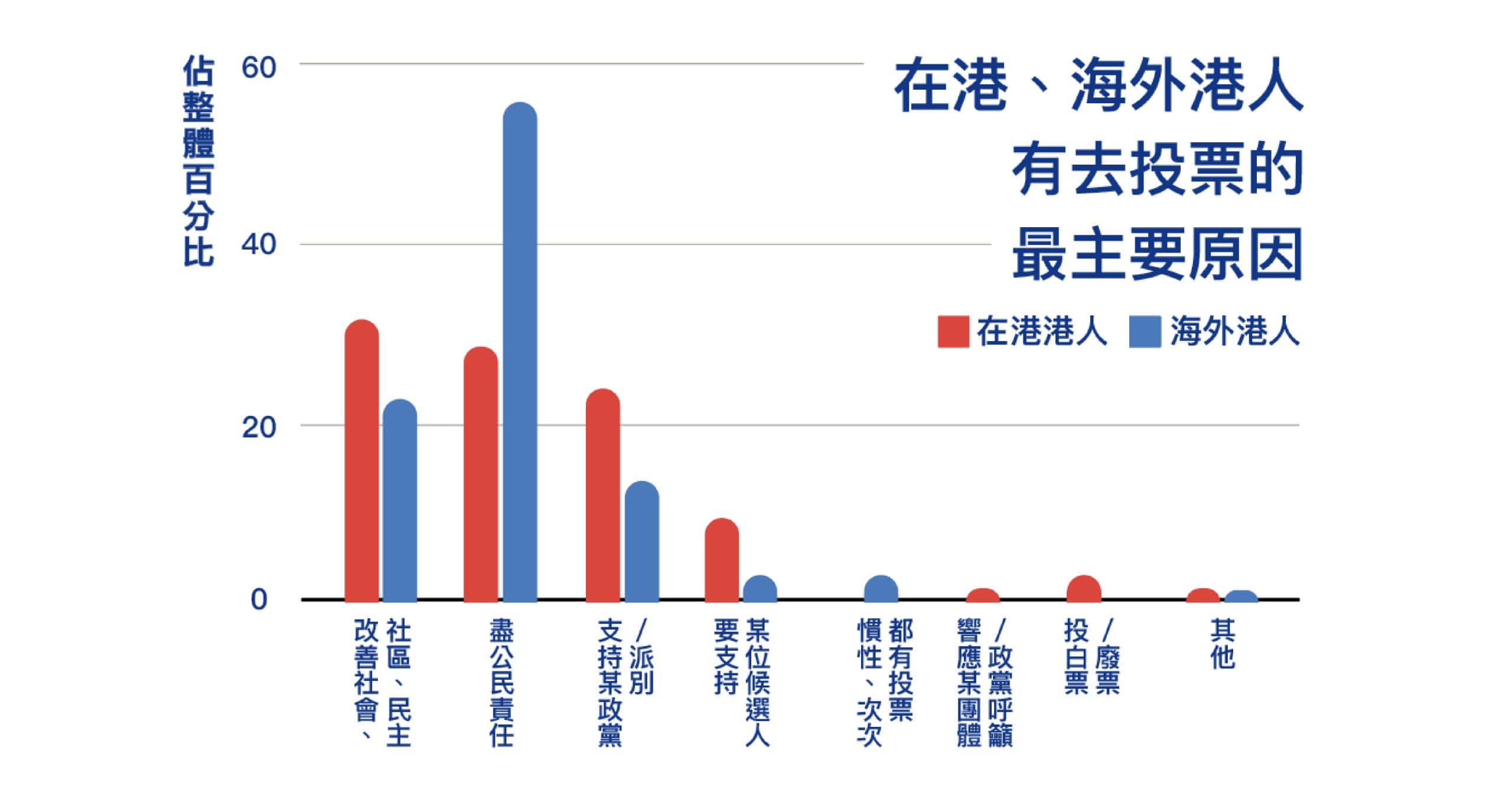 對於有去投票的受訪者,到底他們去投票的最主要原因為何?儘管在香港,只有不到三成受訪這表示有投票,不過,根據我們分析,有 32% 在港受訪者表示是希望藉選舉「改善社會、社區、民生」,其次是表示「盡公民責任」及「要支持某政黨/派別」,分別佔約 28% 及 24%。在海外的港人取態則有所不同,逾 56% 受訪者表示要「盡公民責任」,「改善社會、社區、民生」及「要支持某政黨/派別」分別佔近 23% 及 14%。另外,在香港方面,有約 3% 受訪者在「其他」一欄寫上是為了去「投白票/廢票」,故特別分開標示。