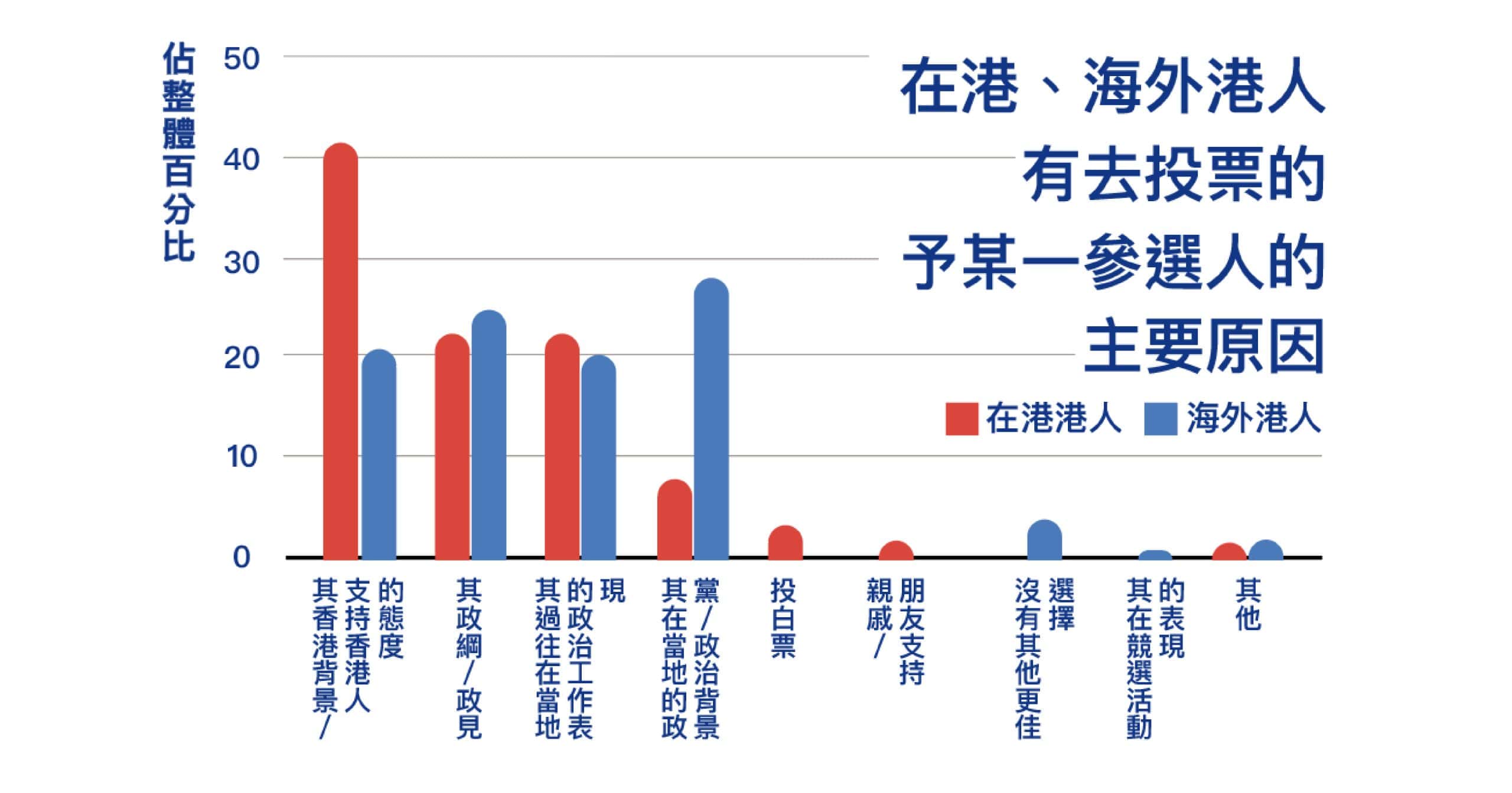 承上,就有投票者用選票去支持某一參選人的主要原因,在香港的受訪者有逾 41% 表示因為「其香港背景/支持香港人的態度」為最多,而揀選此項的海外港人受訪者僅佔 20%,在所有選項中排第三。相反,在海外有投票的受訪者,最為關注參選人「其在當地的政黨/政治背景」,佔 28%;而在港的受訪者揀選此項則只有不到 8%。