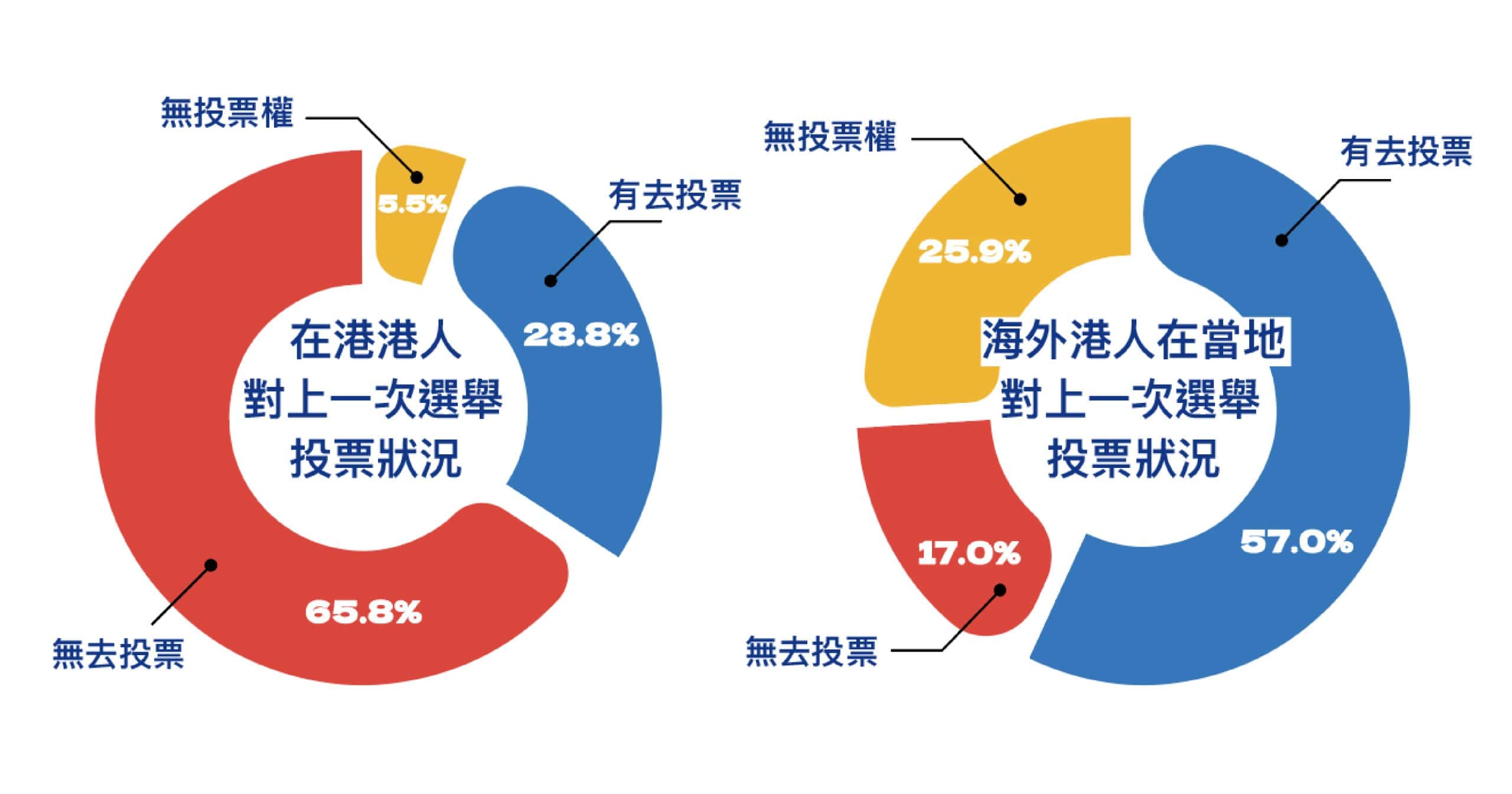 在海外的政治選舉方面1,則有逾 57% 海外港人受訪者表示有去投票,約 17% 表示無去投票;無投票權者則佔約 26%。